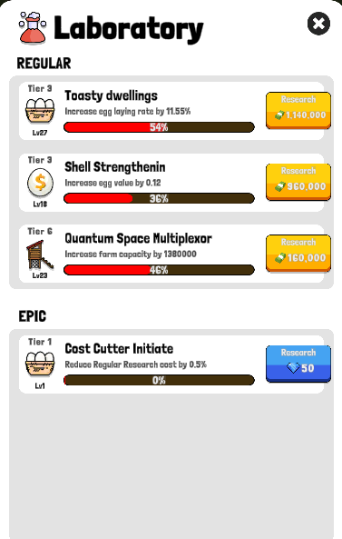 Farmers can enhance their operations by performing upgrades in the **Lab**, which allow for expansion of the Coop, increased egg-laying rates, and higher egg prices in the market. There is a broad array of upgrades available, including those that require Cash and others that need Gems. Each upgrade has its own level scaling and can significantly impact your farm’s growth. So, while diligent effort is key, it's also important to be strategic and make informed choices to optimize your farm’s development!